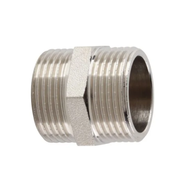 Резьбовой фитинг Reiger – латунный никелированный ниппель для соединения элементов трубопровода равного диаметра. Резьба равнопроходная наружная, трубная цилиндрическая ISO 228, EN 10226. Корпус шестигранной формы, под гаечный ключ.