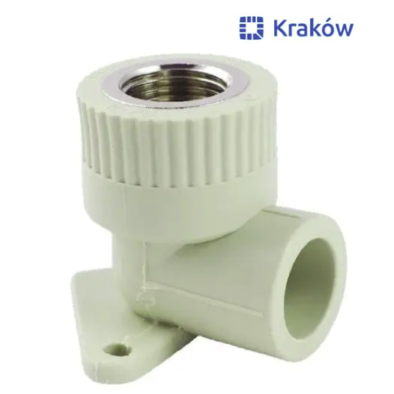 Комбинированный угловой фитинг с креплением с внутренней резьбой, предназначенный для подсоединения к полипропиленовому трубопроводу сантехнического смесителя или другого компонента инженерной системы с резьбовым подключением. Резьба фитинга – внутренняя трубная.