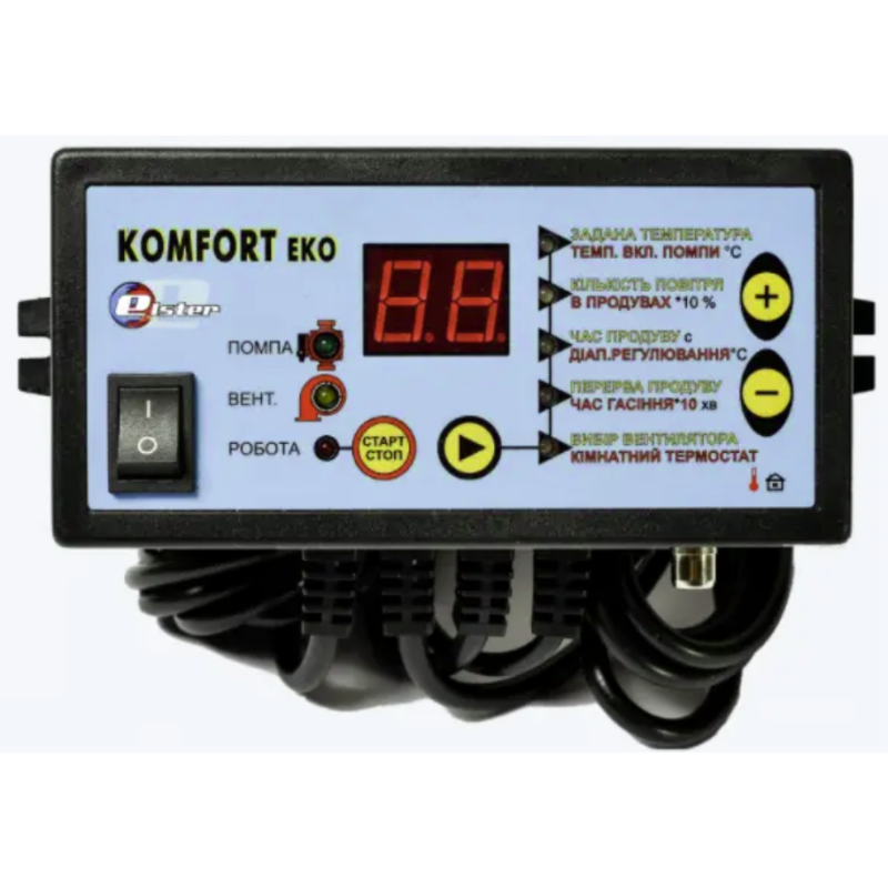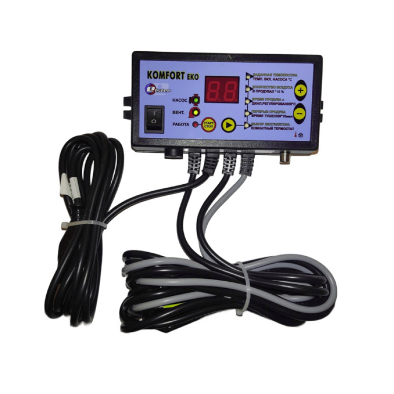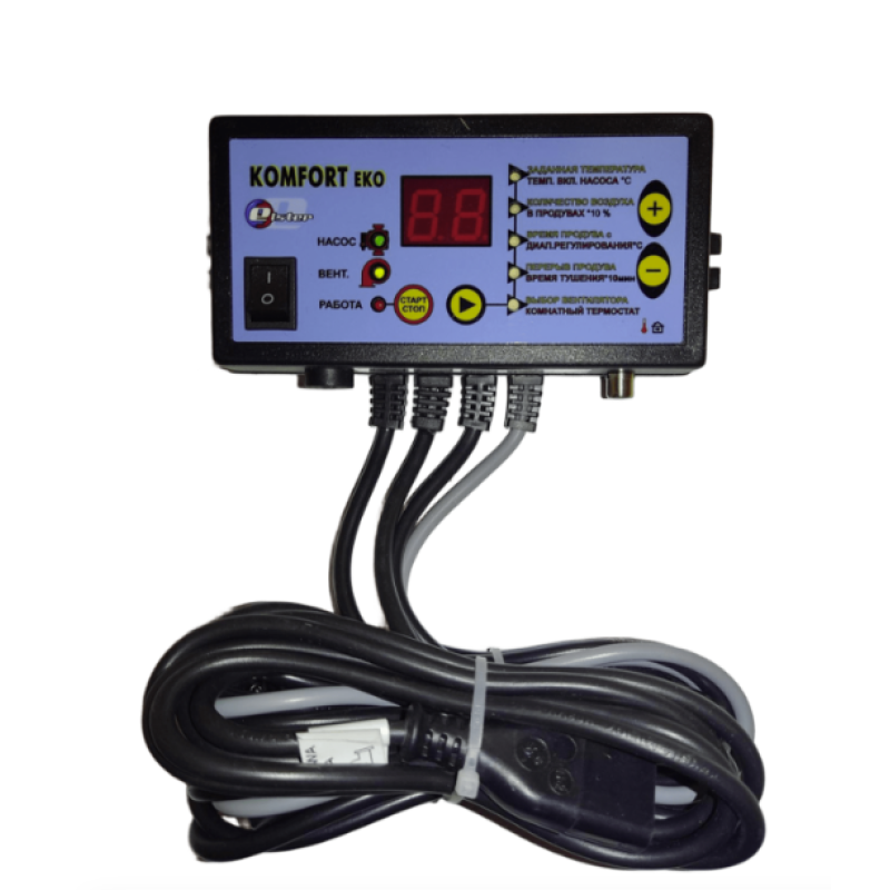 Командный контроллер для твердотопливного котла отопления KOMFORT EKO предназначен для совместной работы с нагнетательной турбиной подачи воздуха и насосом циркуляции воды. Выполняет функцию поддержания температуры на постоянном уровне в отопительной системе. По заданным пользователем параметрам контроллер для твердотопливного котла обеспечивает стабильный процесс горения топлива путем подачи вентилятором оптимального объема воздуха в топочную камеру. При подключении насоса циркуляции воды, контроллер осуществляет его запуск при достижении определенной температуры, заданной пользователем. Это способствует быстрому нагреву воды в котле, а также уменьшению выделения конденсата при сжигании топлива. Автоматика для котла KOMFORT EKO проста в использовании и имеет достаточное количество полезных опций, позволяя настроить систему отопления под индивидуальные потребности.