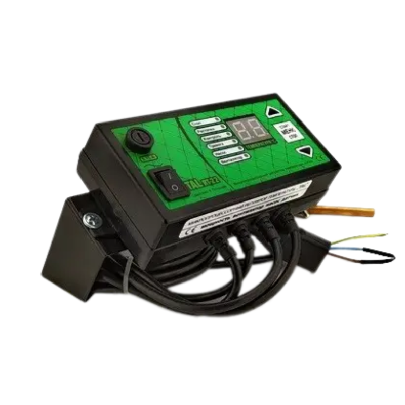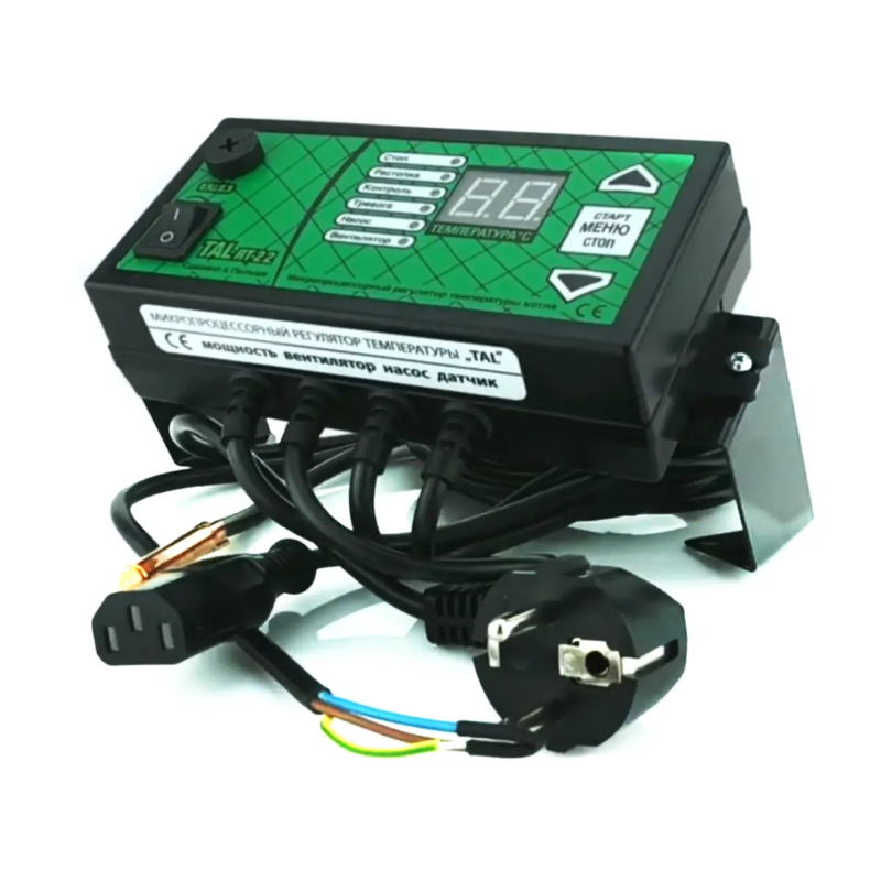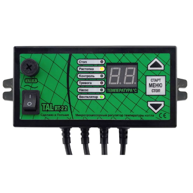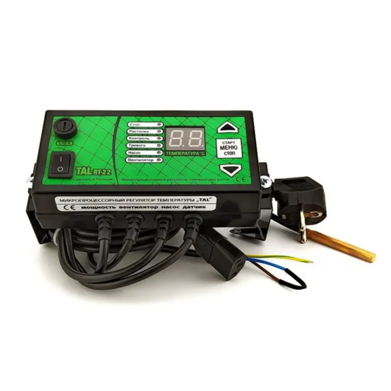 Блок RT-22 TAL Elektronik (Польша) для управления циркуляционным насосом СО и приточным вентилятором твердотопливного котла. Предусмотрены выход на комнатный термостат, функции Анти-Стоп (предотвращает заедание ротора насоса в период простоя, включает насос каждые 7 дней на 10 с), Антизаморозка (включение насоса при температуре СО меньше 5 °C). Чаще всего используется в комплекте с вентилятором WPA-120, который подходит для большинства котлов, мощностью до 30 кВт.