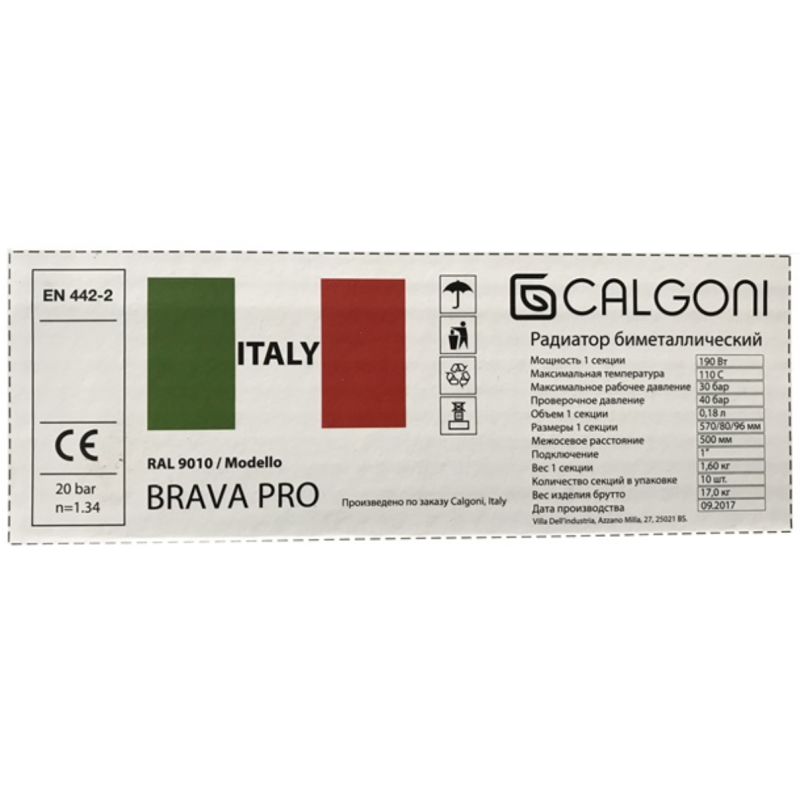 Компанія CALGONI є одним з лідерів у виробництві обладнання і комплектуючих для опалювальних систем. Біметалеві радіатори CALGONI Brava Pro виготовляються в Італії на найсучаснішому підприємстві. Вся продукція компанії CALGONI високонадійна, спрямована на економію енергії, відрізняється невисокою вартістю і спроектована з урахуванням вимог з охорони навколишнього середовища.