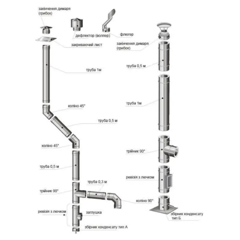 Розташування: Встановлюється зовні будівлі або всередині приміщень з низькими температурами, найчастіше використовується для прокладання димового каналу поза приміщенням.