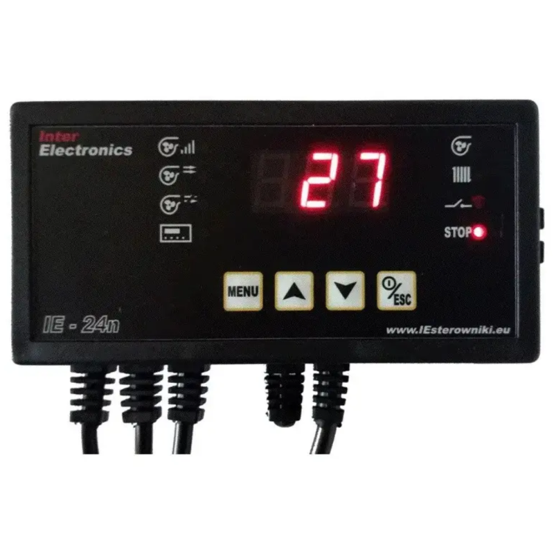 Автоматика для опалювальних котлів на твердому паливі Inter Electronics IE 24n керує нагнітальним вентилятором і насосом циркуляції води. Основним завданням блоку управління є підтримання заданої температури в опалювальному котлі за допомогою вентилятора.