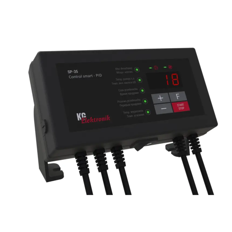 Автоматика для твердопаливних котлів KG Elektronik SP-35 PID – це інтелектуальний, простий у використанні, інноваційний за характеристиками контролер для якісного спалювання дров, вугілля, торфу і відходів деревообробки. Контролює роботу вентилятора наддуву і насоса контуру опалення, з можливістю підключення кімнатного термостата. Як додаткова опція є можливість підключення датчика димових газів PT-1000. Використання нового алгоритму роботи автоматики Control Smart дозволяє найкращим способом забезпечити оптимальні процеси горіння / тління для отримання максимального ККД котла.