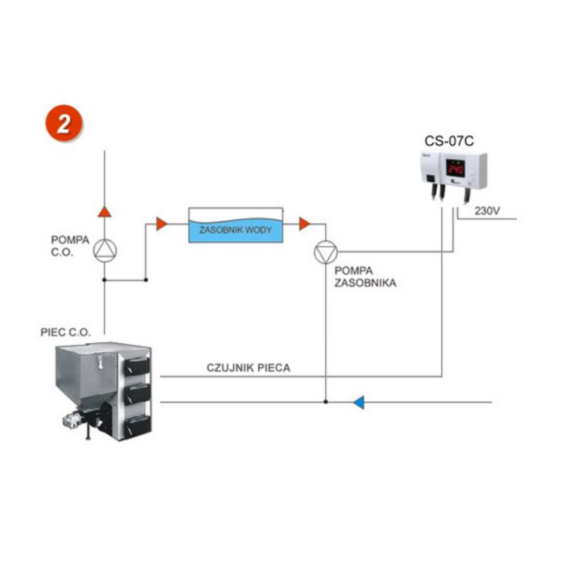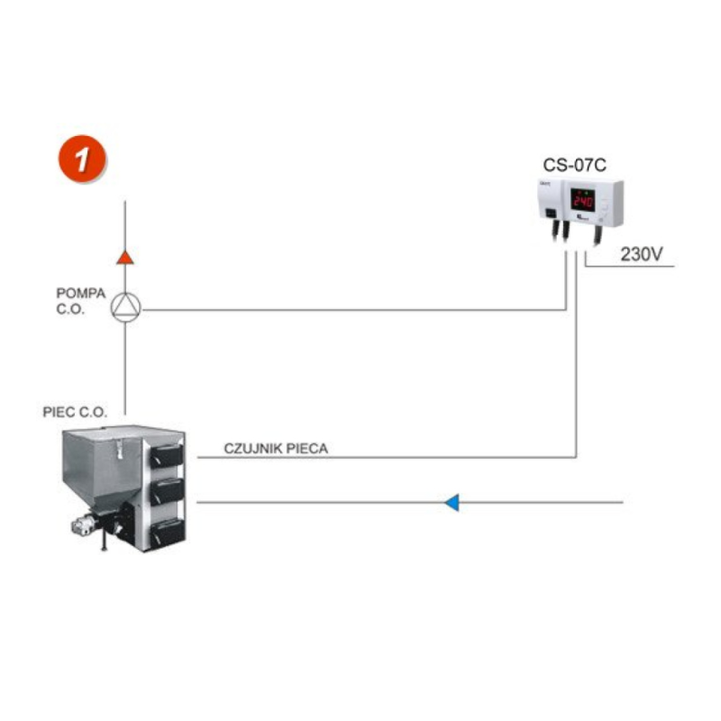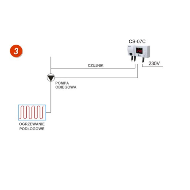 Прилад дає змогу регулювати температуру увімкнення і вимкнення насоса. Насос запускається після перевищення заданої користувачем температури вмикання (O) і вимикається після перевищення заданої температури вимикання (U). CS-07C обладнаний функцією антистопу, яка запобігає застій насоса поза опалювальним сезоном, зупавши її на приблизно 15 секунд кожні 14 днів. Дотримуючись потрібної функції контролера є звукова сигналізація, яка повідомляє про дуже високу температуру. Сигналізація запускається в разі, якщо температура, де встановлений датчик перевищити (90 C). Контролер обладнаний також системою запобігання замерзанню та запускає насос у разі, якщо температура впаде нижче 5 C. Нижче цього показника температури насос працює безперервно. Ця функція дає змогу перевірити справність під'єднаного насоса через одночасне натискання на кнопки. Повторне натискання на кнопки вимкне насос. Між температурою входу в цикл запуску контролера та температурою повернення в режим очікування є різниця. Гістерезис контроллера CS-07C становить 2 градуси. Наприклад, після встановлення температури 50 C насос запускається після перевищення температури 50 C, а вимикається — коли температура впаде до 48 C. — температура вимкнення насоса, термостата тощо, O — нижня межа вмикання насоса/ термостата.