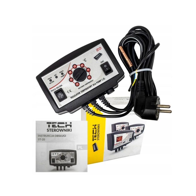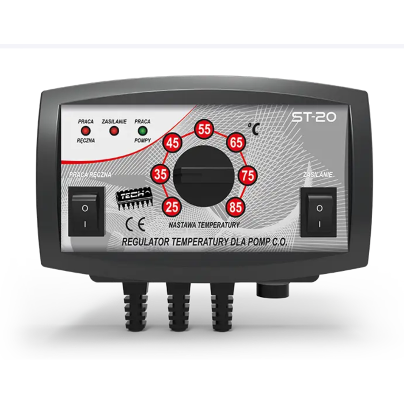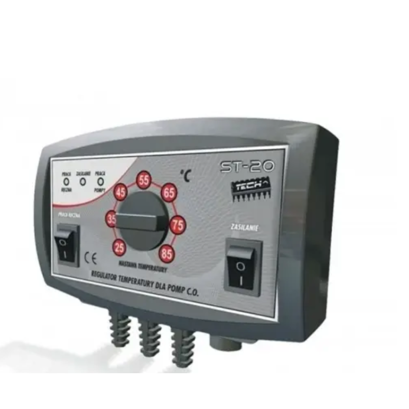 Контролер TECH ST-20 призначений для керування циркуляційним насосом центрального опалення. Встановлення заданої температури здійснюється за допомогою потенціометра. Завданням контролера є: у разі досягнення заданої температури - включення насоса, а також вимикання насоса, якщо температура опуститься на 2 °C нижче заданої. Такий режим роботи запобігає непотрібній роботі насоса, що дозволяє заощадити електроенергію, а також збільшує термін роботи насоса та підвищує його надійність.