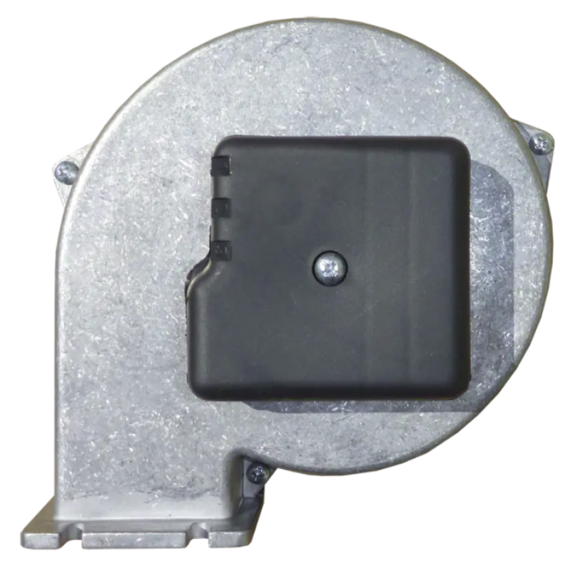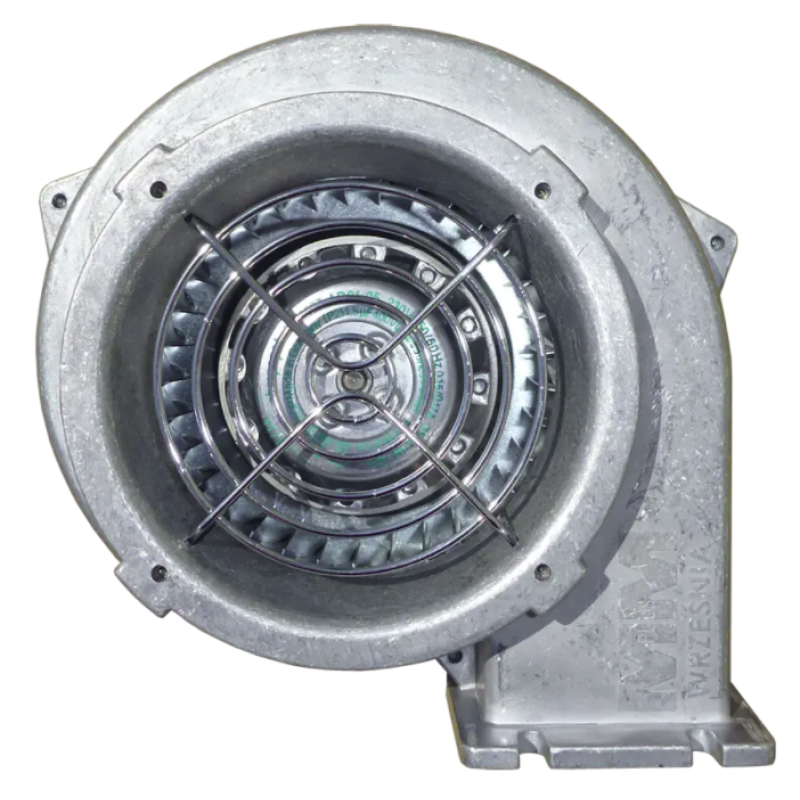 Турбіна для твердопаливного котла складається з двох частин: корпусу, однофазного мотора німецького бренду EBMPAPST і крильчатки. Корпус і крильчатка виготовлені з алюмінієвого сплаву, що перешкоджає утворенню корозії і забезпечує тривалий термін експлуатації. Впускний для повітря отвір захищений сіткою від попадання сторонніх предметів. Монтаж вентилятора на опалювальний котел здійснюється за допомогою спеціальних отворів. Приплив подачі повітря в камеру згорання котла автоматично регулюється металевою заслінкою. При необхідності, можна відрегулювати положення заслінки вручну за допомогою спеціального гвинта з гайкою.