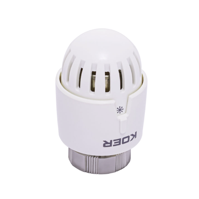 Принцип роботи: зміна кімнатної температури впливає обсяг рідини, що міститься в ємності термостатичної головки. Зміна об'єму викликає переміщення внутрішнього механізму з відповідним закриттям або відкриттям клапана і, отже, модуляцією подачі теплоносія, що надходить в радіатор. Коли в приміщенні досягається бажана температура, головка поступово закриває клапан, залишаючи прохід мінімальної кількості води, щоб підтримувати постійний рівень температури в приміщенні і економити енергію. Використання термостатичних головок дозволяє автоматично підтримувати температуру повітря у приміщеннях на заданому рівні з точністю до 1℃.