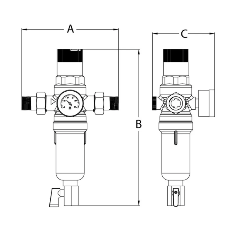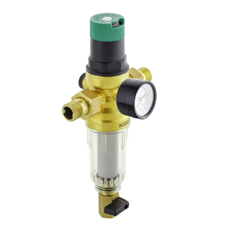 Комбинированный фильтр для горячей воды с подключением 1/2”, 3/4”, 1” сочетает в себе клапан снижения давления и промывной фильтр тонкой очистки.