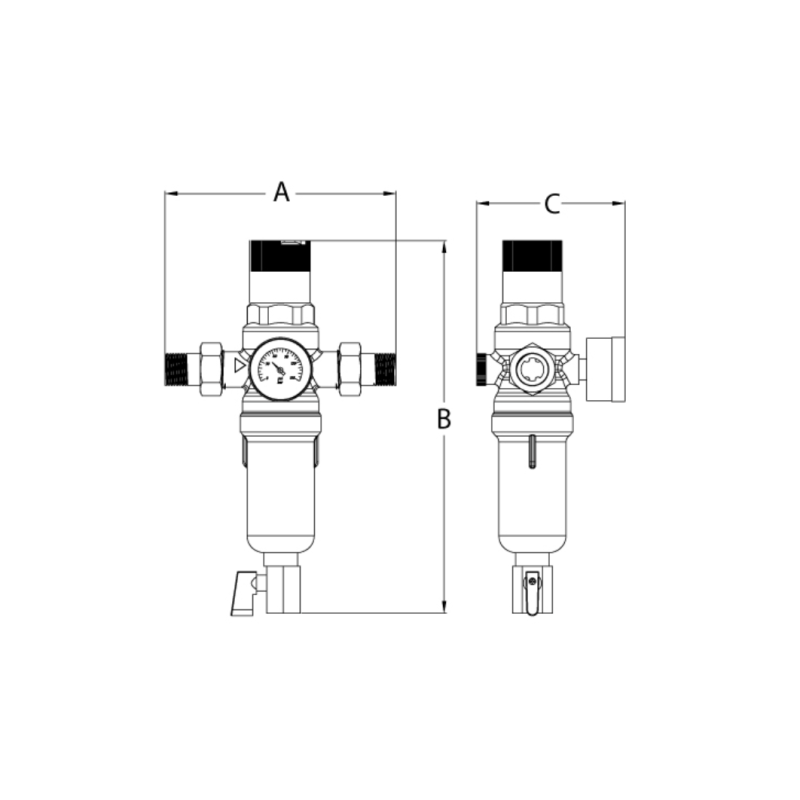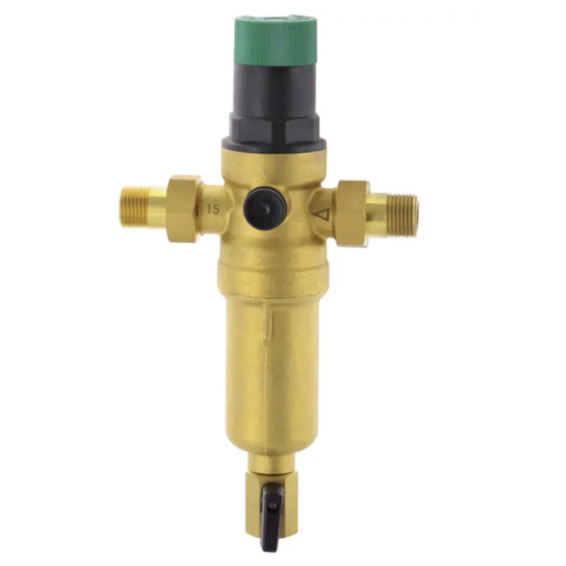 Комбинированный фильтр для горячей воды с подключением 1/2”, 3/4”, 1” сочетает в себе клапан снижения давления и промывной фильтр тонкой очистки.